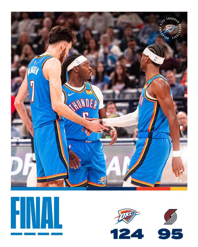 NBA常規賽繼續進行,波特蘭開拓者隊(14勝20負)結束連勝。亞歷山大得到30分,他率隊7人得分上雙,俄克拉荷馬城雷霆隊(29勝5負)前三節逐漸確立大比分優勢,他們在主場以124-95大勝開拓者隊。雷霆隊拿到3連勝,開拓者隊結束2連勝。楊瀚森替補得到3分和5個籃板。