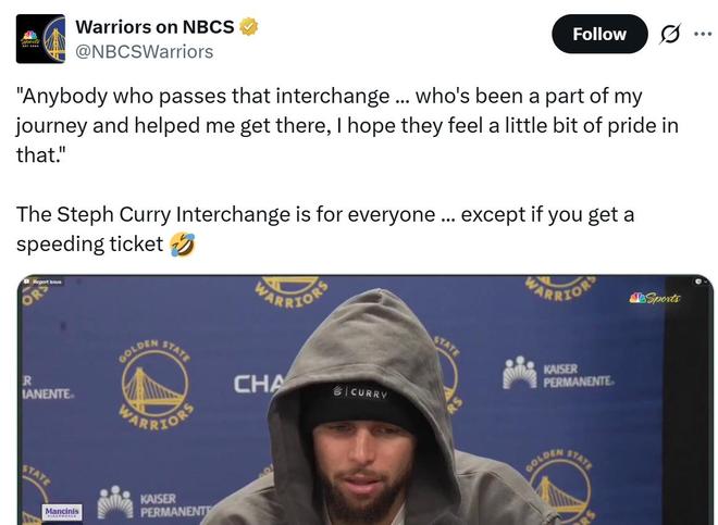 庫里賽后談及這一話題說道:“我打了一輩子球,能夠通過這種方式與社區建立聯系真的是意義重大,我對這份殊榮受寵若驚,也希望陪伴我旅程的每個人都能感到一絲驕傲,當然,如果你超速被罰款,別來找我。”
