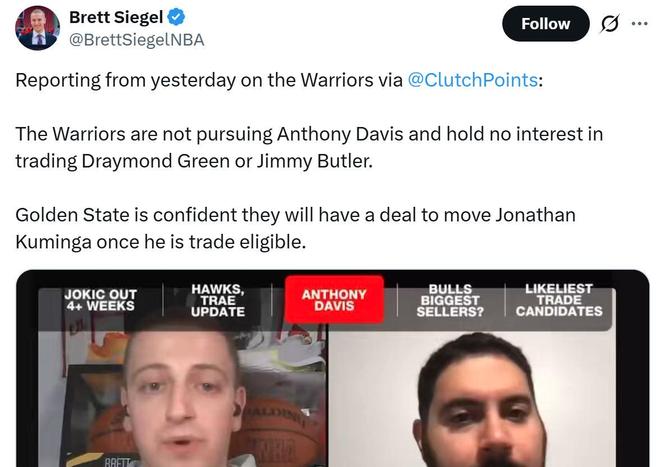 ClutchPoints記者Brett Siegel給出相同說法,指出勇士隊不想交易巴特勒與追夢,也沒有追求濃眉哥,他們相信只要庫明加一符合交易條件,球隊就能迅速完成交易補強。