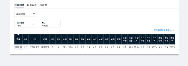 作為選秀球員,截至25-26賽季,賈明儒已累計征戰CBA7個賽季。前6個賽季,他單賽季的場均出場時間就沒超過9分鐘,得分數也未上過雙。但本賽季,賈明儒已打成山西隊次主力控衛。