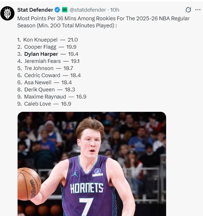 實際上本賽季新秀每36分鐘得分,哈珀場均19.4分僅次于克努佩爾21分、弗拉格19.9分,只可惜哈珀的登場時間遠不如前兩人。