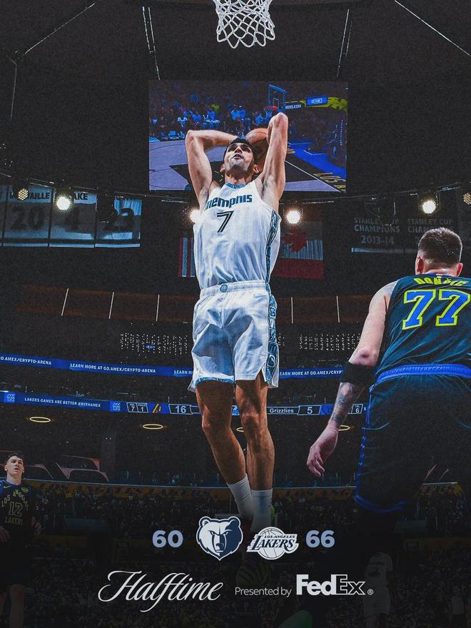 莫蘭特上半場7中2,僅得6分3助攻2失誤,正負值-22。東契奇8中2,得到13分4板4助2斷4失誤。詹姆斯10中6拿到17分6板3助3失誤,拉拉維亞9中7砍下18分5板1助0失誤。第三節(jié)陷入拉鋸戰(zhàn),湖人拉不開比分,灰熊也無法反超。