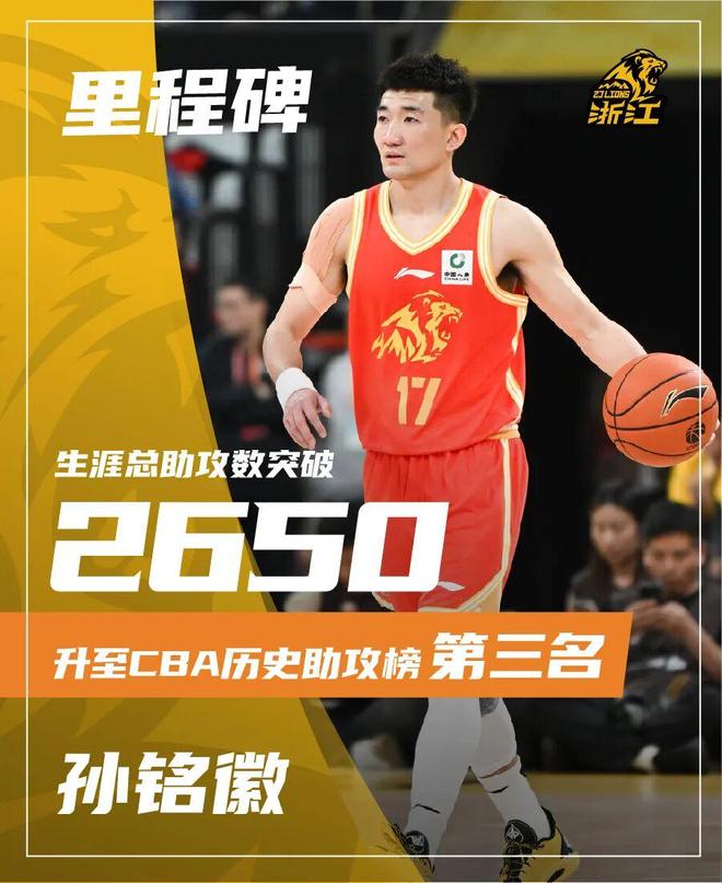 CBA常規賽第10輪,浙江方興渡再戰北京北汽。雙方在比賽的大部分時間里處于膠著態勢,末節在胡金秋的帶領下,幫助浙江方興渡占據場上優勢,贏下本場比賽。最終,浙江方興渡77-74戰勝北京北汽,豪取8連勝。本場比賽,孫銘徽CBA生涯總助攻數達到2658次,超越郭艾倫(2649次)升至CBA歷史助攻榜第3。