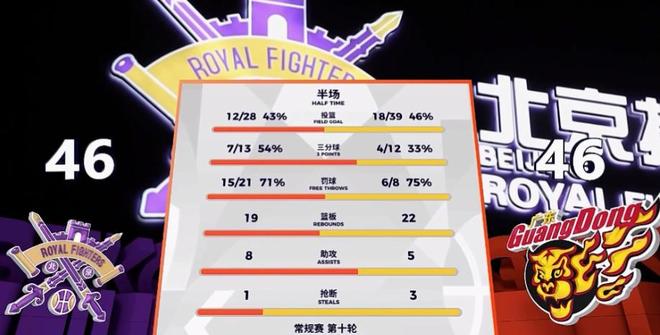 半場戰罷,在罰球8-21,三分命中數4-7被北控碾壓的情況下,廣東依靠薩姆納薩林杰胡明軒三人合砍的41分(薩林杰半場打滿),46-46戰平北控。