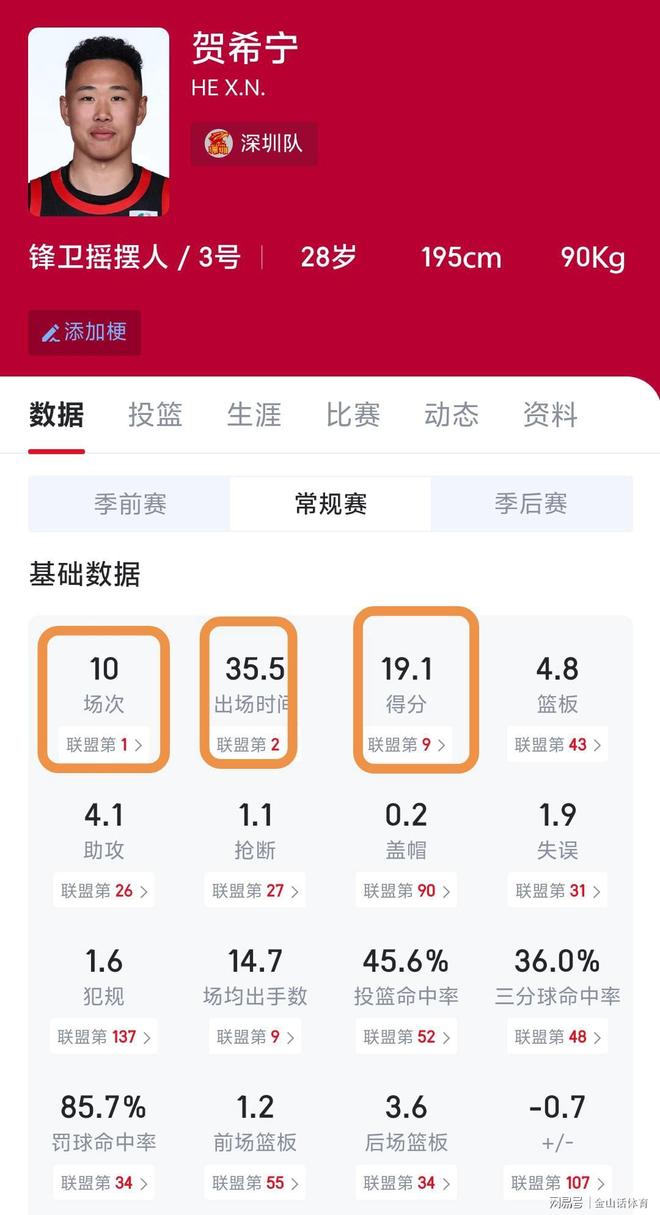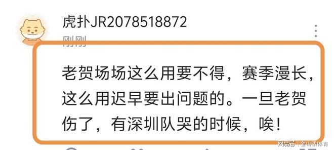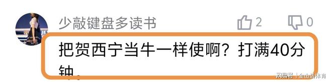 全場打滿40分,如此超負荷運轉,也讓球迷們心疼不已。“把賀希寧當牛一樣使?。看驖M40分鐘。”;“生產隊的驢都不帶這么用的”;“牛都不敢這樣用啊。真牛逼”;“老賀每場都這么用要不得,賽季漫長,這么用遲早要出問題的。一旦老賀傷了,有深圳隊哭的時候,唉!”……