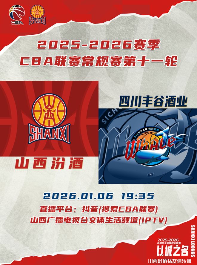 北京時間2026年1月6日19:35,2025-2026賽季CBA聯賽常規賽第11輪繼續進行,山西汾酒主場迎戰四川豐谷酒業。球迷觀眾可以通過抖音(搜索CBA聯賽)、山西廣播電視臺文體生活頻道(IPTV)觀看比賽實況,與我們一起鬧他!