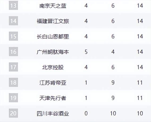 積分榜后半段,山東隊(duì)少賽兩輪暫列第11,新疆隊(duì)4勝6負(fù)守住季后賽守門員位置。同曦、福建、吉林三隊(duì)?wèi)?zhàn)績同為4勝6負(fù),競爭激烈。廣州隊(duì)5勝4負(fù)位列第十六,北控、江蘇、天津、四川等隊(duì)排名靠后,其中四川隊(duì)遭遇10連敗,一勝難求,繼續(xù)墊底。