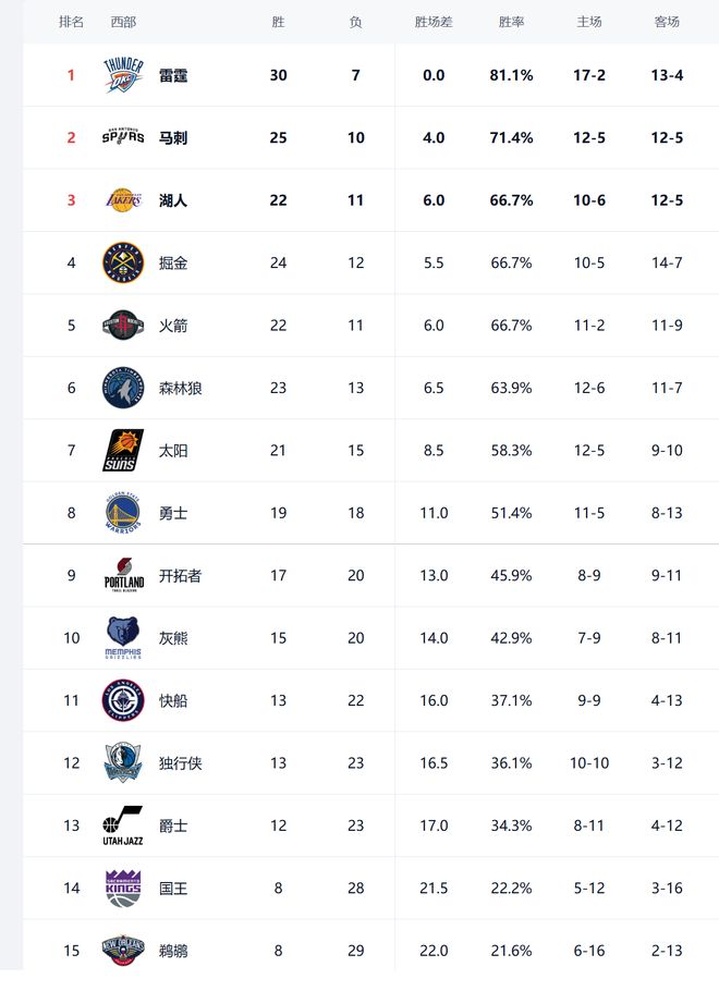 北京時間2026年1月6日,今日NBA有8場比賽,勇士、火箭、快船、掘金、雷霆、太陽、開拓者、爵士參與其中,賽后西部排名發生了變化。