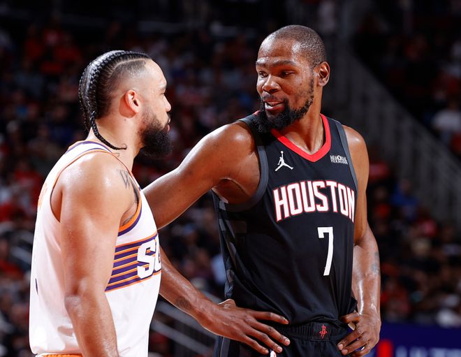 火箭客場挑戰太陽,火箭少了申京、范弗利特,太陽少了杰倫格林,太陽是背靠背比賽,他們昨日和雷霆鏖戰四節后以3分優勢擊敗雷霆,體力消耗巨大,本以為他們不是體力充沛的火箭對手,沒想到太陽長時間壓制火箭,一度領先13分,不過到了第四節時太陽體能不足的問題顯現,火箭一度反超7分,但太陽很頑強,他們又追平了比分,比賽還剩5秒時布克中投不中,火箭球權,暫停回來杜蘭特在還剩1秒時投中三分,火箭3分優勢險勝太陽。杜蘭特21中9得到26分10板4助,阿門13中5得到17分7板6助,太陽方面布克20中9得到27分3助,奧尼爾12中5(全是三分)得到15分6板3助2斷。