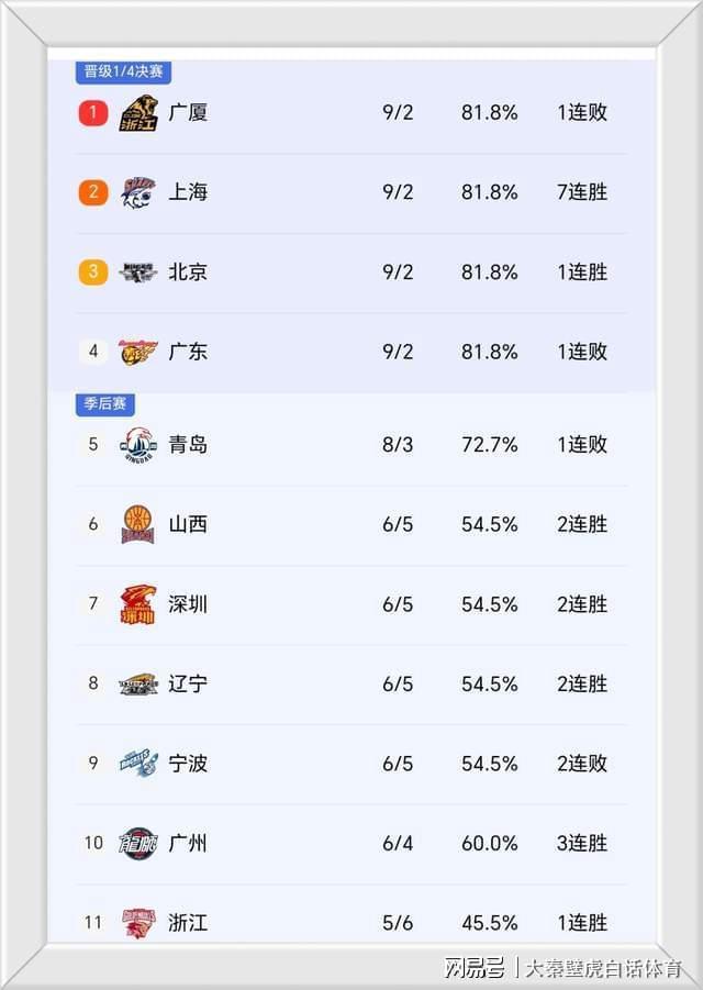 ①、排名前4的廣廈、上海、北京隊(duì)和廣東隊(duì)?wèi)?zhàn)績(jī)都是9勝2負(fù),最“吃虧”的是廣東隊(duì),上一輪遭到爭(zhēng)議判罰被絕殺,不僅痛失榜首寶座,還在4強(qiáng)中排名墊底;