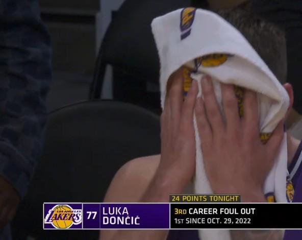 在第四節(jié)最后時刻,東契奇在防守雄鹿后衛(wèi)小凱文-波特時盡管已經(jīng)非常小心但仍被吹罰三分犯規(guī),但此時湖人也沒有挑戰(zhàn)機會因此東契奇也被吹了第六次犯規(guī)不得不離場。下場后東契奇感到非常不滿,他回到替補席后怒摔毛巾。