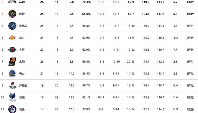 根據(jù)西部最新的排名情況,雷霆在以一分險(xiǎn)勝灰熊之后,球隊(duì)遙遙領(lǐng)先。那么剩下的10支球隊(duì)將成為季后賽+附加賽的競(jìng)爭者,并且在西部前七位的爭奪中,戰(zhàn)況特別激烈。