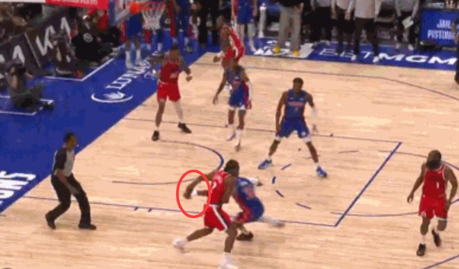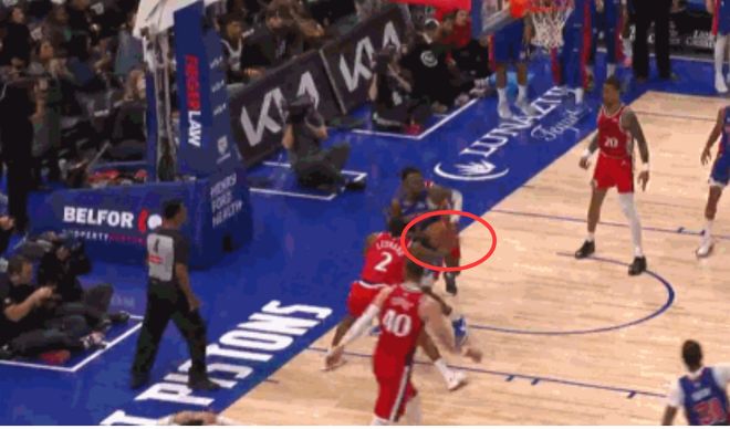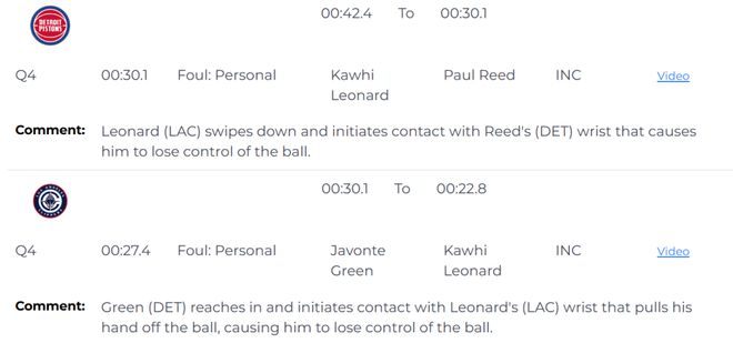 第二次漏判,出現在距離比賽結束還有27.4秒,也就是萊昂納德搶斷完成后不久,活塞隊的格林伸手切球,也碰到萊昂納德的手腕,將他的手從球上撥開,致使萊昂納德丟球。這同樣是一次漏吹的防守犯規,不過,這一球最終出界,球權還在快船手中。