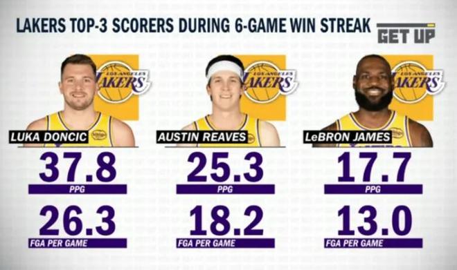 3月18日,目前湖人已經取得43勝25負的戰績,豪取六連勝,排名西部第三,根據美國媒體統計,在過去六連勝期間,湖人三巨頭表現出色,東契奇場均貢獻37.8分,里弗斯25.3分,詹姆斯17.7分。