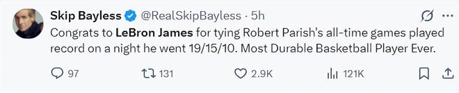 賽后最強詹黑斯利普-貝勒斯都被打服了,他寫道:恭喜勒布朗打破了帕里什的生涯出場次數(shù),他拿到19+15+10。他是有史以來最頑強的籃球運動員之一。