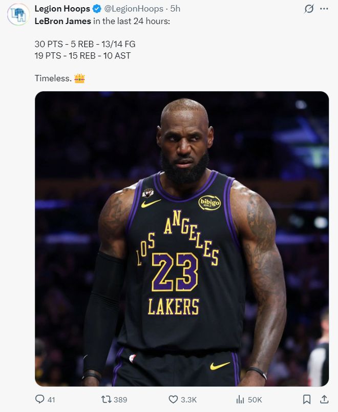 美媒LH寫道,詹姆斯背靠背兩場比賽26中21,拿到49分20籃板12助攻,命中率80.8%。