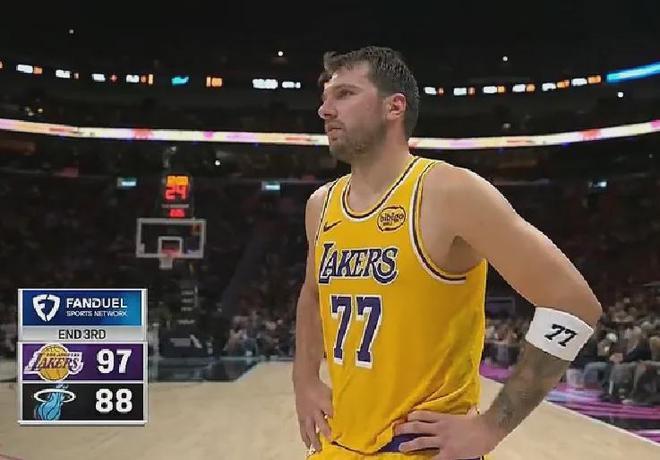 第三節東契奇迎“nan”而上徹底發威,單節投籃10中6(三分7中4)獨攬19分2板3助并且送出3次搶斷,成功帶領湖人反超熱火,以97-88進入到末節。