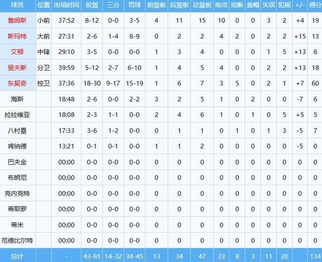 詹姆斯則再次打出高效率表現,上一場VS火箭投籃14中13砍下30分5板2助,本場打熱火則是投籃12中8得到19分15板10助三雙數據,背靠背兩戰合計投籃26中21,命中率高達約80.8%。