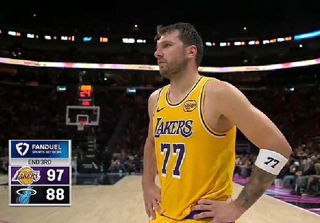 第三節東契奇迎“nan”而上徹底發威,單節投籃10中6(三分7中4)獨攬19分2板3助并且送出3次搶斷,成功帶領湖人反超熱火,以97-88進入到末節。