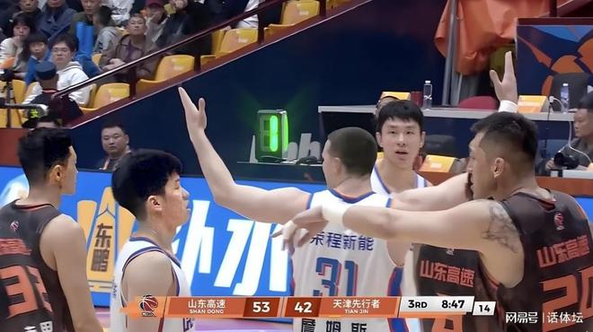 約翰遜、瓊斯接連制造威脅,山東男籃進(jìn)一步擴(kuò)大分差。瓊斯不斷做出精彩的策應(yīng),郭凱輕松上籃命中,張德貴趕緊請(qǐng)求暫停。暫?;貋?,羅諾茲很快領(lǐng)到了第4次犯規(guī),由于比分較大,山東男籃在攻防兩端有些放松,引起了邱彪不滿。半場比賽結(jié)束,天津男籃落后14分。