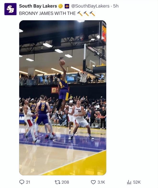 詹姆斯也在個人的IG上轉發了布朗尼對陣步行者時的單臂劈扣,老父親對大兒子的愛還是那么的強烈。