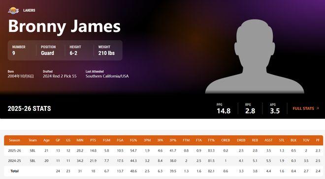 一天前,湖人137-130擊敗步行者,這場比賽詹姆斯與布朗尼父子同臺登場,布朗尼打主力輪換13分鐘,4中2,拿到4分1籃板1助攻2搶斷1蓋帽,命中率50%,正負值+4,他充當了斯瑪特的替身去領防對方的小后衛。
