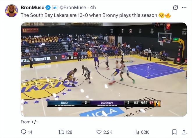 湖人媒體BraonMuse寫道:本賽季布朗尼代表南灣湖人出戰時,南灣湖人是13勝0負。更多的比賽布朗尼還是留在洛杉磯湖人訓練、隨隊。