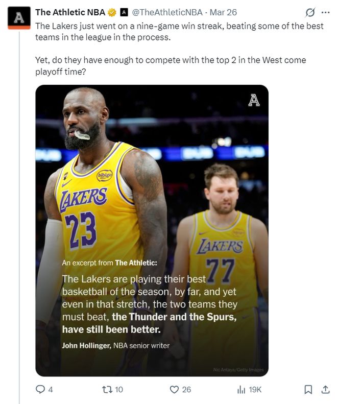 換言之湖人本賽季達成52勝+西部前三號種子就有沖冠概率,而且文中還提到:詹姆斯、東契奇、里夫斯的化學反應在不斷改善。洛杉磯剛剛找到了勒布朗與里夫斯之間的正確平衡,加上肯納德交易到來后球隊板凳席能力的提升,湖人在西部的確有沖冠的可能性。