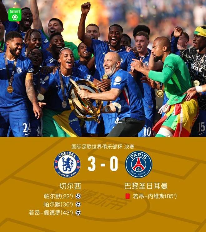 世俱杯決賽在美國新澤西州大都會人壽體育場展開角逐,切爾西對陣巴黎圣日耳曼,本場主裁判為法加尼(澳大利亞)。上半場,帕爾默天神下凡推射梅開二度后又助攻若昂-佩德羅挑射破門。下半場,若昂-內維斯拽庫庫雷利亞頭發被直紅罰下。最終,切爾西3-0完勝巴黎,奪改制后世俱杯首冠!