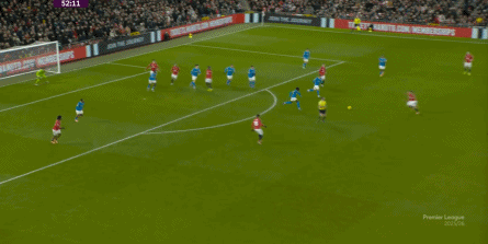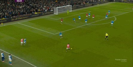丟球的狼隊開始提高強度,這讓曼聯面對的壓力增加,但對手的體系也有開始出現松散的危險,于是曼聯仍有表現,還能在達洛特的協助下,從右側建立出轉移到左側的進攻線路: