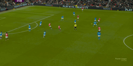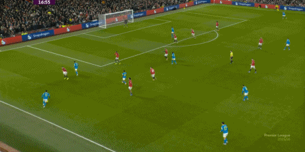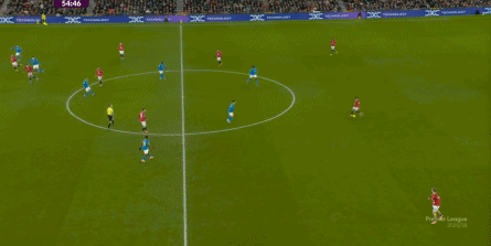 在大面兒上,依然是343的站位,通過這一站位和人員結構來在防守端出力,倒是還說得通,但是在進攻端,開局的曼聯已經展現出需要依靠庫尼亞單打的情況了: