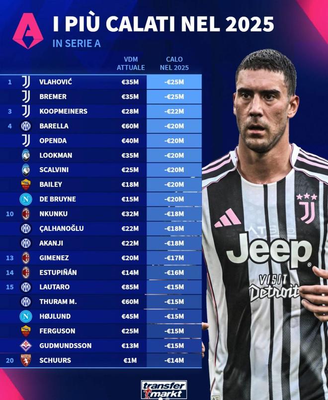 北京時間12月31日,德轉列出了意甲2025年球員身價跌幅榜,尤文圖斯包攬前三,弗拉霍維奇和布雷默下跌2500萬歐元并列第一,庫普梅納斯下跌2200萬歐元第三。