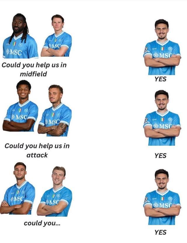 對于自己萬金油的屬性,埃爾馬斯也在社交媒體上發(fā)了一張梗圖進(jìn)行了自嘲,這張梗圖的內(nèi)容是安古伊薩和麥克托米奈提問:“你能在中場幫助我們嗎?”埃爾馬斯回復(fù)道:“可以。”隨后內(nèi)雷斯和諾阿-朗提問:“你能在進(jìn)攻端幫助我們嗎?”埃爾馬斯繼續(xù)說道:“可以。”最后洛倫佐-盧卡和霍伊倫也提問:“你能......”沒等他們問完,埃爾馬斯搶答道:“可以。”