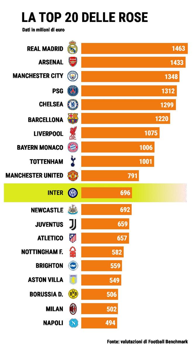 根據(jù)其最新的12月版本評估,國際米蘭全隊估值為6.96億歐元,接近7億歐元,在全球范圍內(nèi)排名第11位,在意大利俱樂部中位列第一。作為對比,尤文圖斯為6.59億歐元,AC米蘭5.02億歐元,那不勒斯4.94億歐元,均進入歐洲前20。