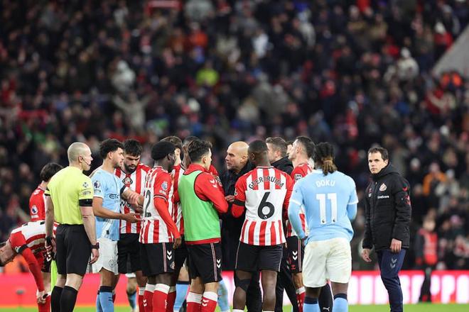 或許是對于丟分失望,賽后多納魯馬等曼城球星,還與桑德蘭球員起了沖突。顯然,曼城球員也被桑德蘭的主場表現和頑強的防守,給氣到破防了。