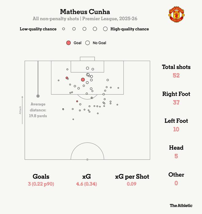 正如去年夏天所指出的那樣,庫尼亞是上賽季xG超額完成最明顯的球員之一,這樣的效率不太可能在老特拉福德持續(xù)。目前,庫尼亞保持了2024-25賽季的射門頻率,但進(jìn)球運(yùn)氣有所下降。回顧他上賽季的射門分布,他既有遠(yuǎn)射,也有在點球區(qū)與六碼區(qū)之間完成的機(jī)會。在加盟曼聯(lián)的首個賽季進(jìn)行到一半時,這些行為模式仍在出現(xiàn),但成功率有所降低。