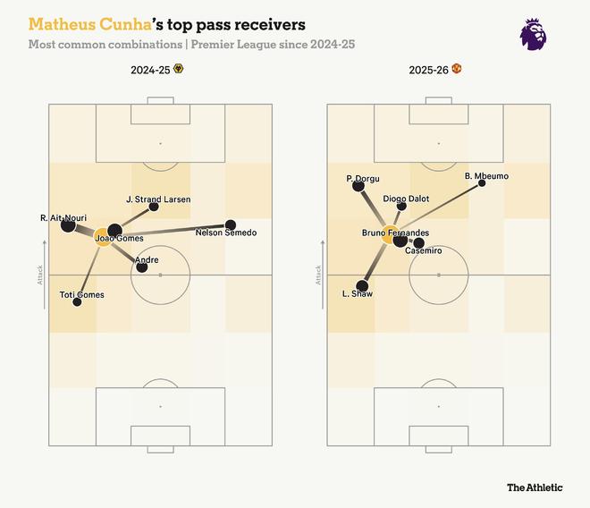 值得肯定的是,阿莫林和庫尼亞在多場比賽中找到了新的方式,即便沒有類似狼隊時期拉森那樣的中鋒。在安菲爾德2-1的勝利證明了球隊在無中鋒體系下的可行性,庫尼亞更多通過爭搶長傳后的第二落點,并在轉(zhuǎn)換階段參與進(jìn)攻。曼聯(lián)在比賽中偶爾會在對方禁區(qū)前出現(xiàn)一小段進(jìn)攻空當(dāng),但庫尼亞正在嘗試?yán)@開這一空間,而不是被限制其中。需要注意的是,本賽季多古和達(dá)洛特從庫尼亞腳下接球時所處的位置靠前。曼聯(lián)2025-26賽季的走勢,在很大程度上將取決于翼衛(wèi)在進(jìn)攻三區(qū)的表現(xiàn)。
