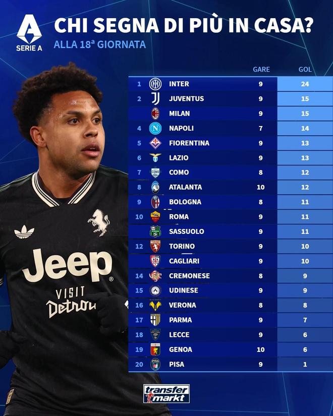 北京時間1月5日,在意甲前18輪結(jié)束后,德轉(zhuǎn)列出了本賽季意甲球隊主場進(jìn)球數(shù)排行榜,國際米蘭以9場打進(jìn)24球斷檔領(lǐng)先,尤文圖斯和AC米蘭同以15球并列第二位。