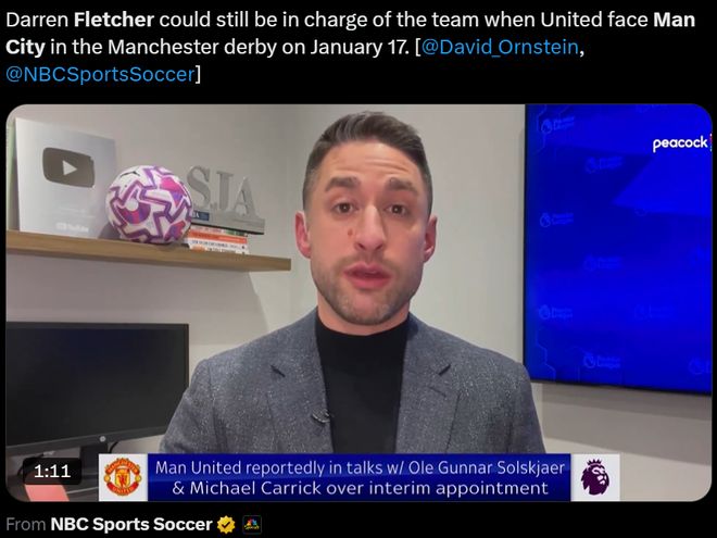 英媒稱,曼聯不會在周日的足總杯之前確定正式的臨時主帥人選。權威轉會專家大衛·奧恩斯坦甚至稱,如果有波折,弗萊徹有機會繼續帶隊參加下周的曼徹斯特德比戰。