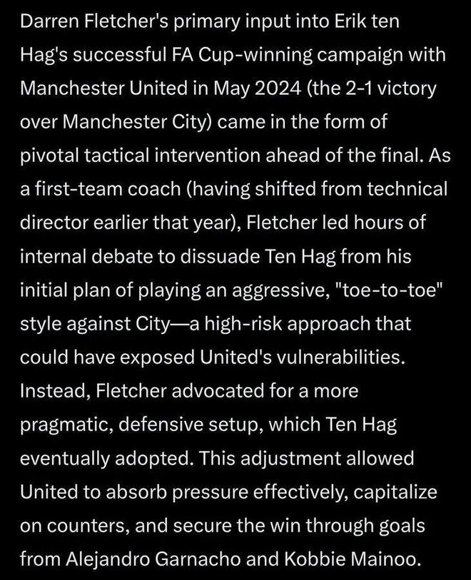 相反,弗萊徹主張采取更為務實、防守為主的戰術安排,最終滕哈格采納了這一建議。曼聯守住了對手,利用反擊機會由加納喬和科比·梅諾的進球贏球奪冠。