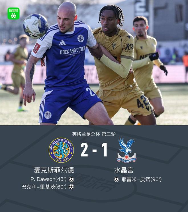 北京時間1月10日英格蘭足總杯 第三輪,麥克斯菲爾德對陣水晶宮。麥克斯菲爾德P. Dawson破門,巴克利-里基茨破門。水晶宮耶雷米-皮諾破門。最終比分麥克斯菲爾德 2-1 水晶宮。