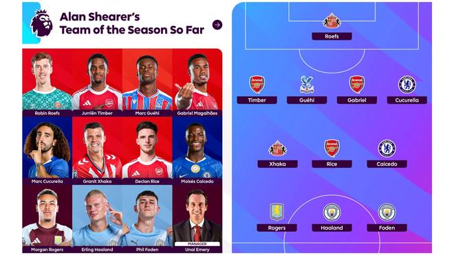 英超官方發布了阿蘭-希勒評選的英超本賽季至今最佳陣容,哈蘭德領銜,賴斯、凱塞多、扎卡等人在列。